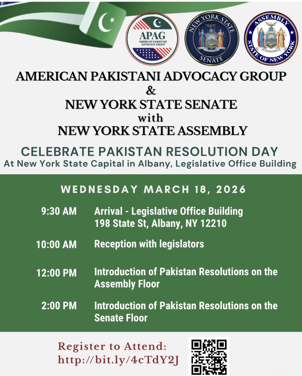 American Pakistani Advocacy Group (APAG) in collaboration with the New York State Senate and Assembly will host the Pakistan Resolution Dar celebration at the State Capitol.