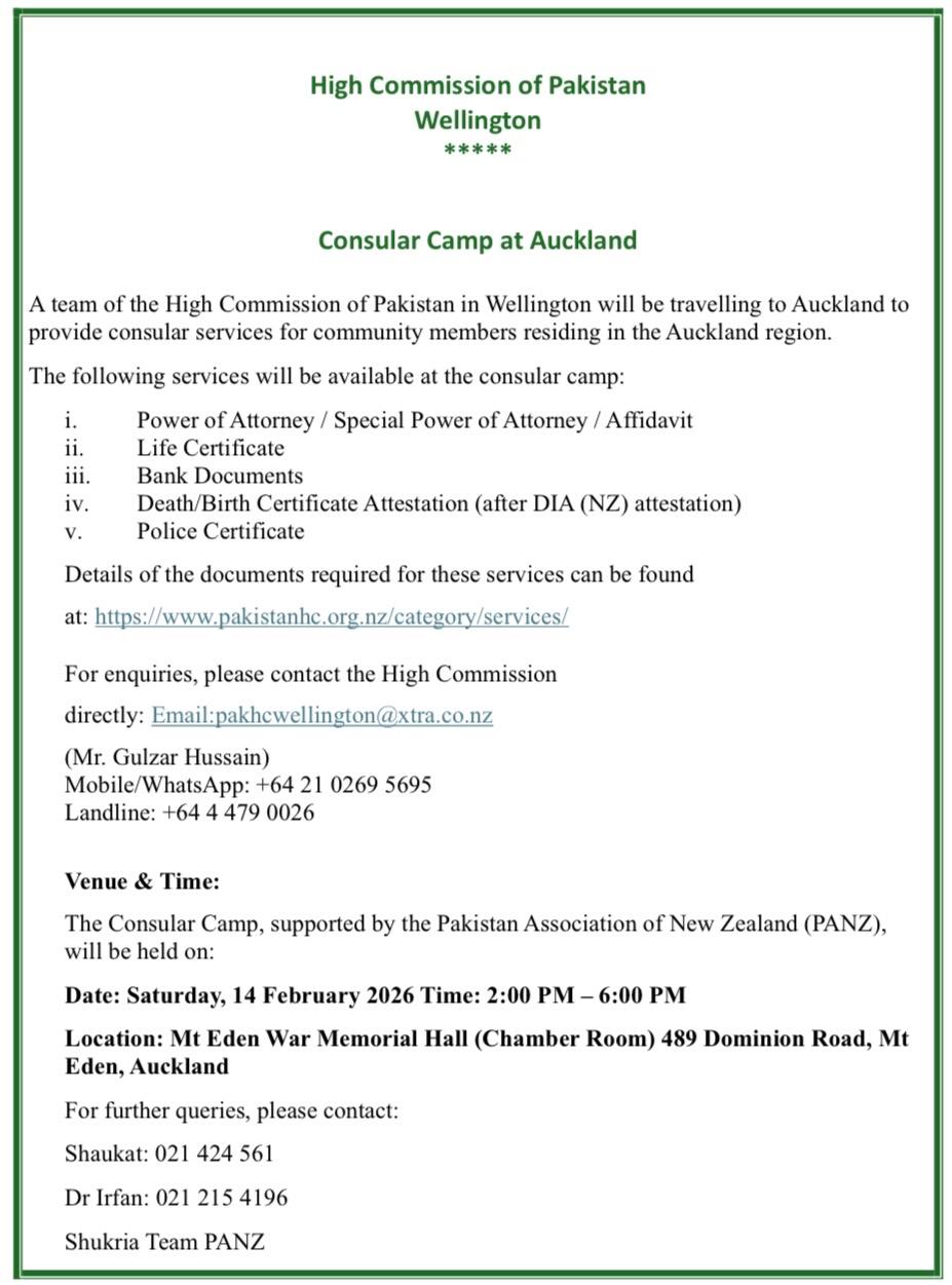 The consular camp, supported by the Pakistan Association of New Zealand (PANZ), will be held at Mt Eden War Memorial Hall (Chamber Room), 489 Dominion Road, Mt Eden, Auckland on February 14 from 2pm to 6pm.